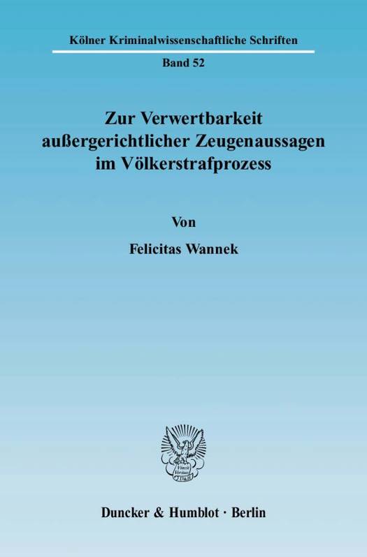 Vor diesem Hintergrund untersucht Felicitas Wannek die Rechtsprechung des UN ad-hoc-Tribunals für das ehemalige Jugoslawien sowie die Regelungen des deutschen, englischen und französischen Rechts zur Verwertbarkeit außergerichtlicher Zeugenaussagen. Unter Berücksichtigung der Vorgaben des Art.6 (3)(d) der Europäischen Menschenrechtskonvention macht sie Vorschläge für die Behandlung solcher Vernehmungssurrogate in Verfahren vor dem IStGH.