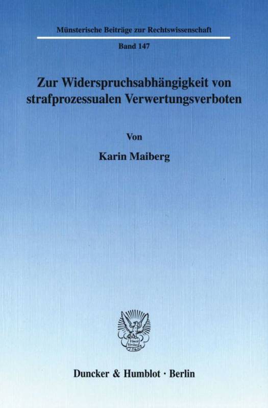 Karin Maiberg hat sich zum Ziel gesetzt, die dogmatische Rechtfertigung dieser richterlich statuierten Widerspruchsobliegenheit zu untersuchen. Sie kommt zu dem Ergebnis, dass eine solche Widerspruchsobliegenheit nicht in Einklang zu bringen ist mit der geltenden deutschen Strafprozessordnung. Gleichwohl versucht sie in einem weiteren Schritt Lösungsansätze für die Probleme, die die Aufstellung eines solchen Widerspruchserfordernisses für die Hauptverhandlung und den Rechtsmittelzug mit sich bringt, aufzuzeigen.
