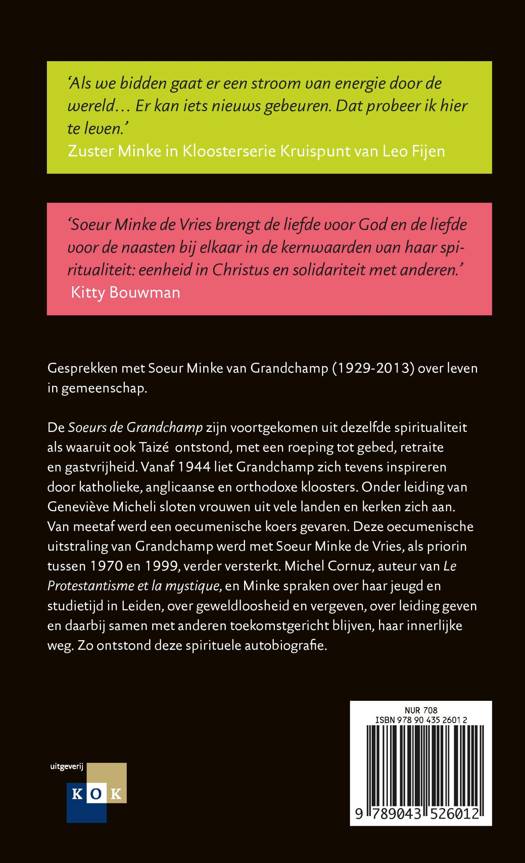 Zuster Minke van Grandchamp bevat gesprekken met haar over haar geestelijke levensweg in Grandchamp. 30 jaar lang was zij priorin in deze protestantse communiteit, gelegen bij Neuchâtel in Franssprekend Zwitserland. Grandchamp is de vrouwelijke pendant van Taizé. Samen met Pomeyrol en Taizé herontdekte Grandchamp het monastiek geïnspireerde leven binnen het Franssprekende protestantisme.