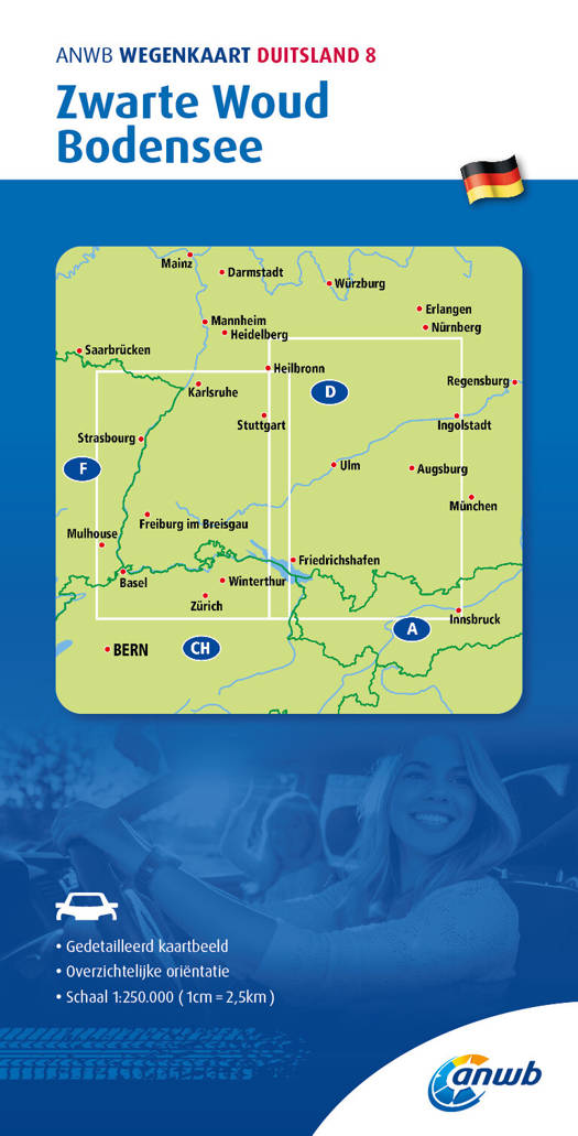 Met de gedetailleerde en nauwkeurige ANWB Wegenkaart Duitsland 8. Zwarte Woud, Bodensee ga je goed voorbereid op autovakantie. Schaal van 1:250.000 (1 cm = 2,5 km).