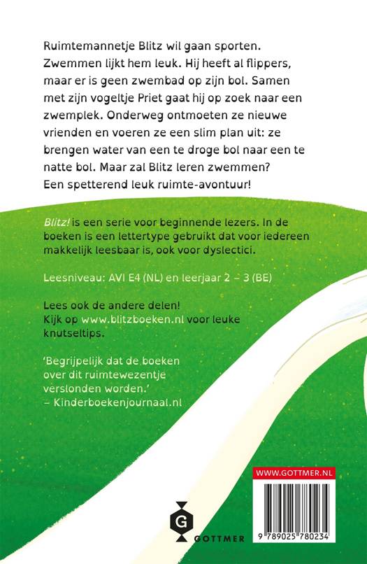 'Blitz! 9 - Zwemmen in de ruimte' (AVI E4, vanaf 7 of 8 jaar) is het negende deel in de leukste AVI-serie voor beginnende lezers! Rian Visser heeft met 'Blitz! ' een serie neergezet die enorm tot de verbeelding spreekt en ervoor zorgt dat kinderen met veel plezier zullen leren lezen. Haar verhalen zijn spannend en toegankelijk, maar zetten ook aan tot nadenken. De grappige illustraties van Lars Deltrap wekken het Blitz-universum op weergaloze wijze tot leven.In 'Zwemmen in de ruimte' besluit Blitz wat meer te gaan bewegen en zwemmen lijkt hem wel wat. Maar helaas: zijn bol is te klein voor een zwembad. Samen met zijn trouwe vriendje Priet begint hij aan een vrolijk ruimteavontuur op zoek naar een geschikte zwemplek. Onderweg ontmoeten ze nieuwe vrienden en bedenkt Priet een slim plan om water naar een andere bol te brengen. Het hoogtepunt? Een frisse duik in het grote zwembad op de bol van Oel en Waps!De AVI-boeken over het ruimtewezen Blitz van Rian Visser en Lars Deltrap zijn mateloos populair bij beginnende lezers en ze zijn goed toegankelijk voor lezers met dyslexie. Ook in 'Blitz! 9 - Zwemmen in de ruimte' is een lettertype gebruikt dat voor iedereen makkelijk leesbaar is. Zo kan iedereen zelf lezen over de wereld vol raketten, ruimtewezens en ufo's. Dit leesboek is geschreven op gecertificeerd AVI-niveau voor lezers in groep 4 en geschikt voor lezers vanaf 7 of 8 jaar.